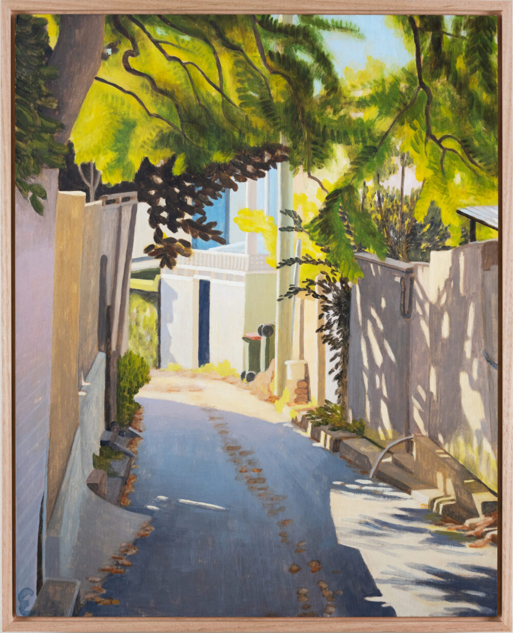 “I spent a great deal of time in 2024 exploring the stepped maze of streets and alleys that traverse and connect the many pockets of Paddington. My base is the City, and while I had a general familiarity with the area, I was looking to delve into a more intimate understanding of the distinctively local. For ‘The Paddington Project’ specifically I was hunting for expansive moments of revelation that would translate into larger scale compositions. Along the way, I collected a photographic library cataloguing intriguing moments of sunshine, humour, colour, form, pattern and personality – compositionally better suited to the narrative snapshot of the board sizes I work with most frequently in my practice: windows into my adventures on foot, an outsider taking notes on my journeys. The ‘Paddington Stories’ (2025) series was mined from a deep dive into this rich visual archive, to share the special moments that continued to surprise and delight me on my way – the architecture and flora will look familiar to Sydney locals but each work tells a story that might take an unexpected twist from the predictable. Rhythm and light, atmospherics and drama all remain central preoccupations.”