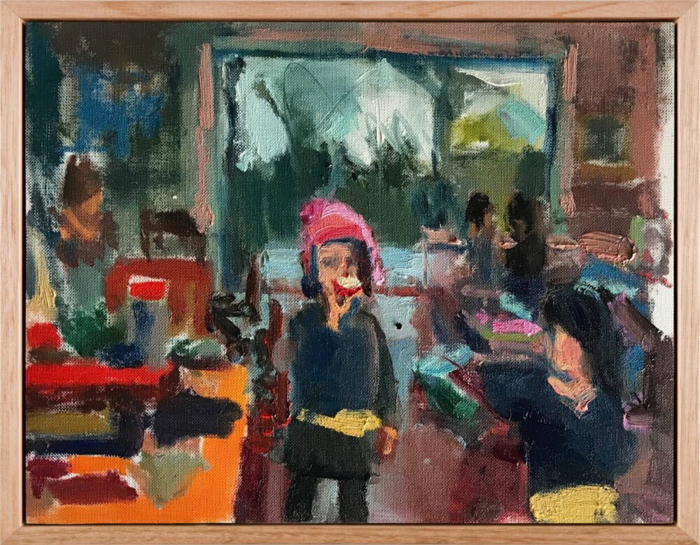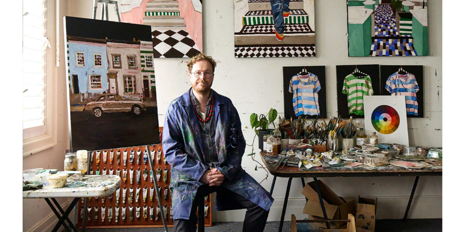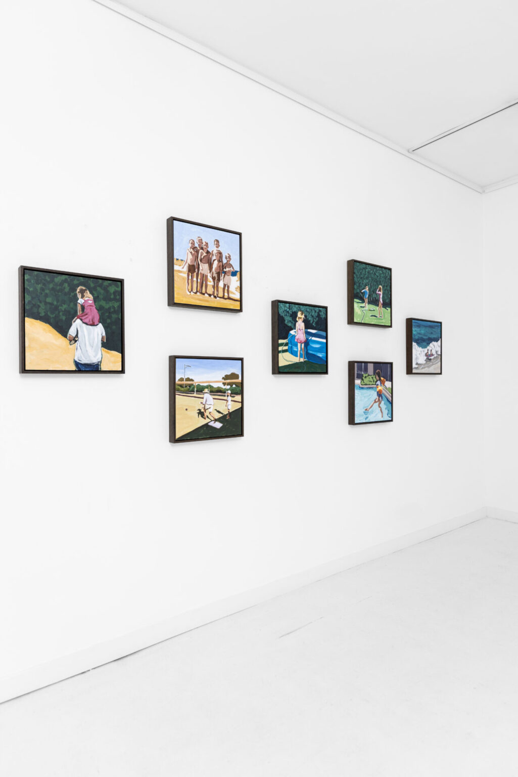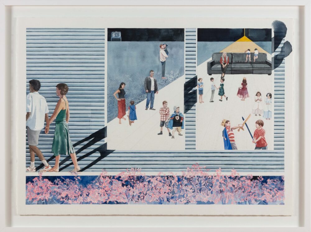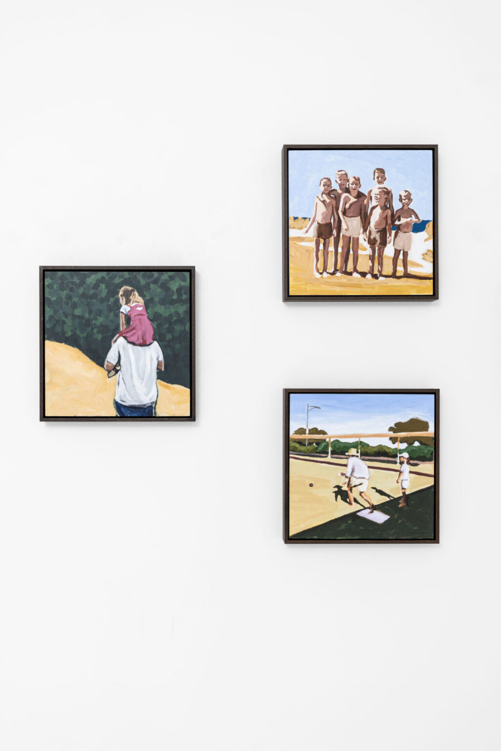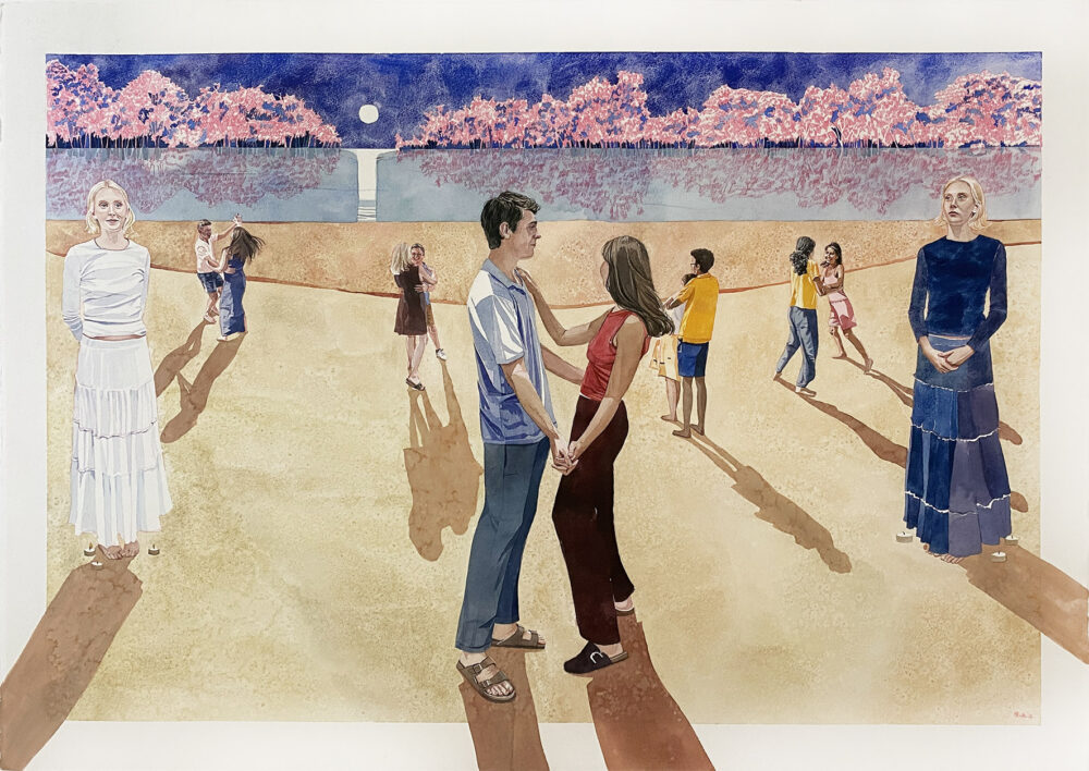 “This series explores fleeting, tender moments from suburban Australian life – children running through the sprinkler, a dad and daughter at the bowls club, a girl waiting for her paddle pool to fill,” says Raisbeck, who, in addition to her NEAP nod, has been a finalist in many other major awards, including the Naked and Nude Art Prize. “These quiet scenes, drawn from old and new photographic references, are part of an ongoing investigation into how we connect with the past and the people who shaped us.”