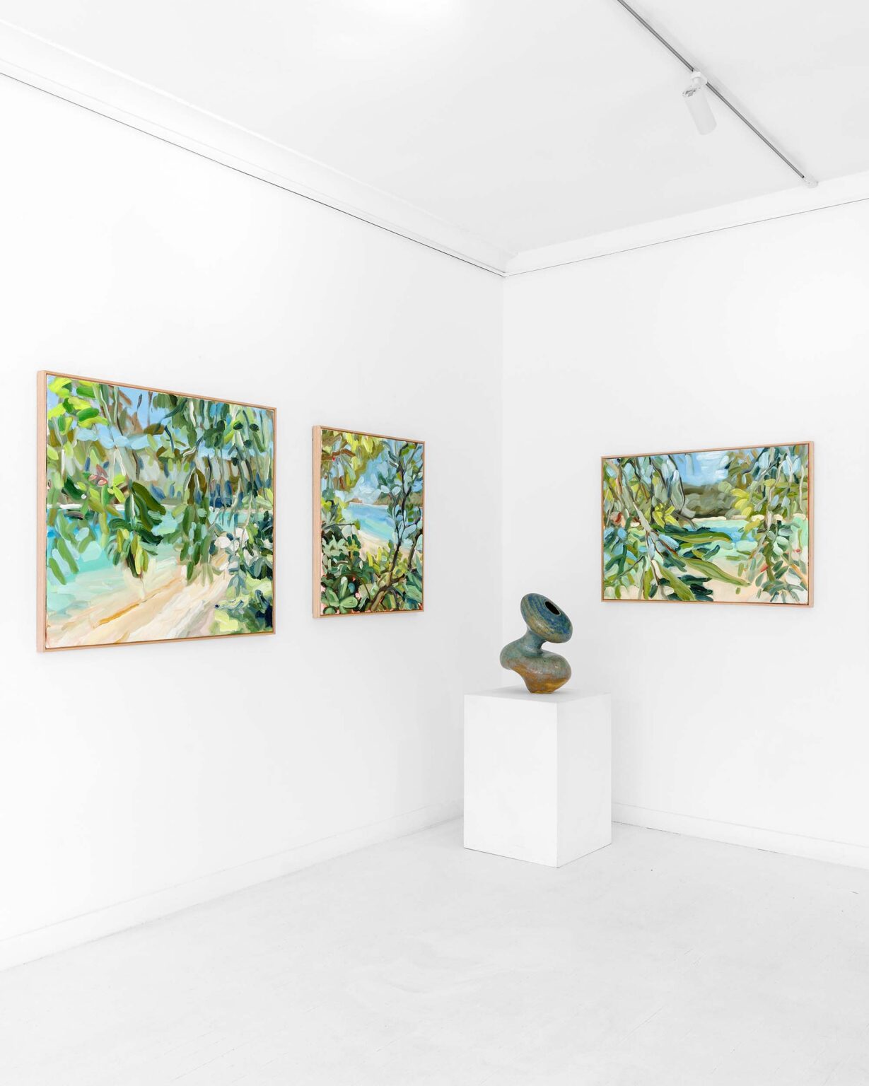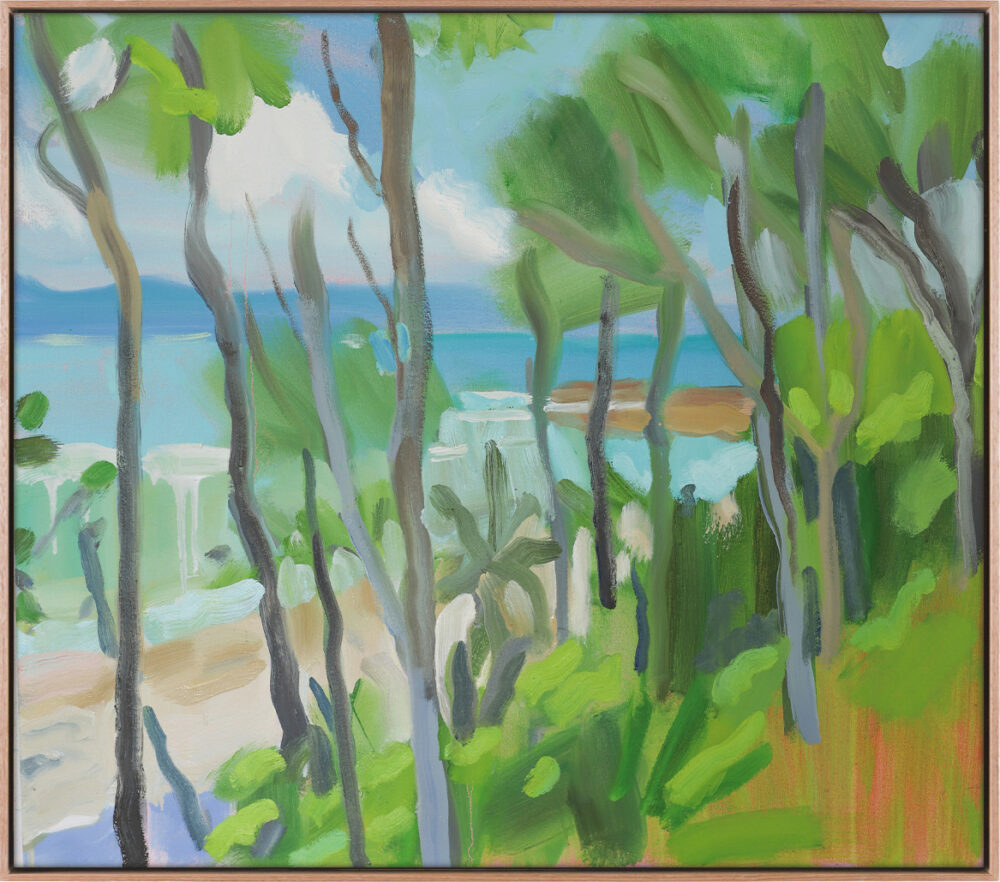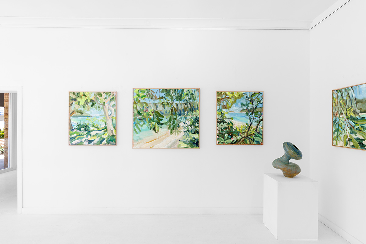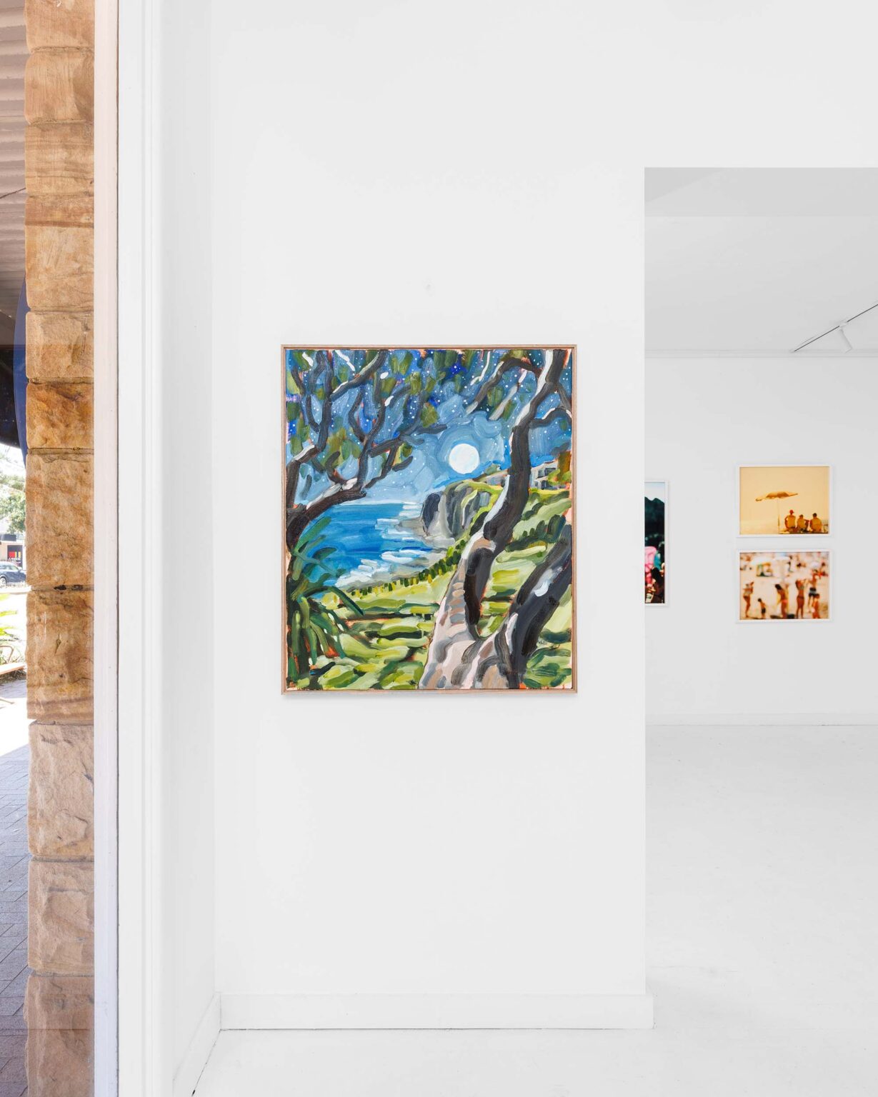 Alongside the sunlit seascapes that have become a hallmark of her practice, Coastal Canopies presents a suite of beachy nocturnes in which deep ultramarine skies appear dusted with a smattering of stars and moonlight glides above darkened waters and silhouetted trees. These paintings carry a hushed, enchanted atmosphere, evoking the particular magic of a breezy subtropical summer night soundtracked by the rhythmic roar of the ocean.