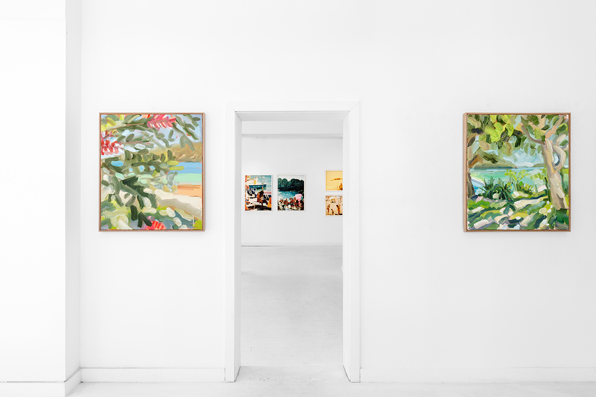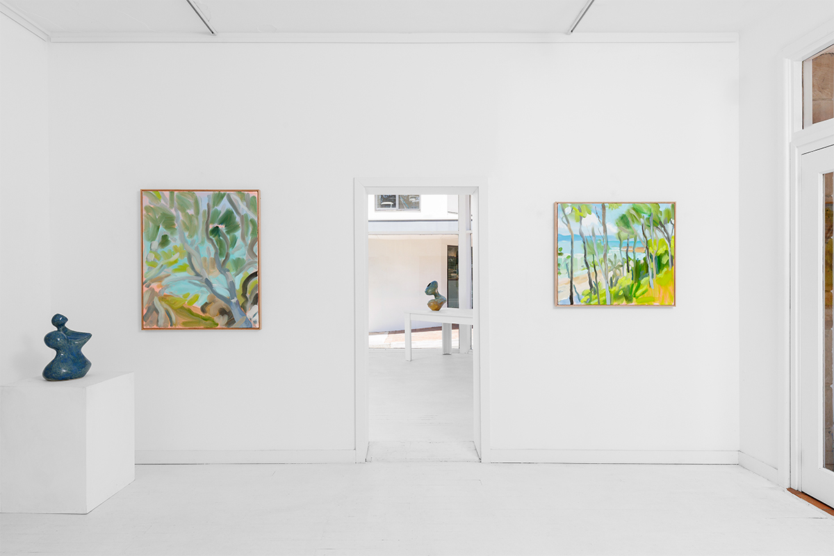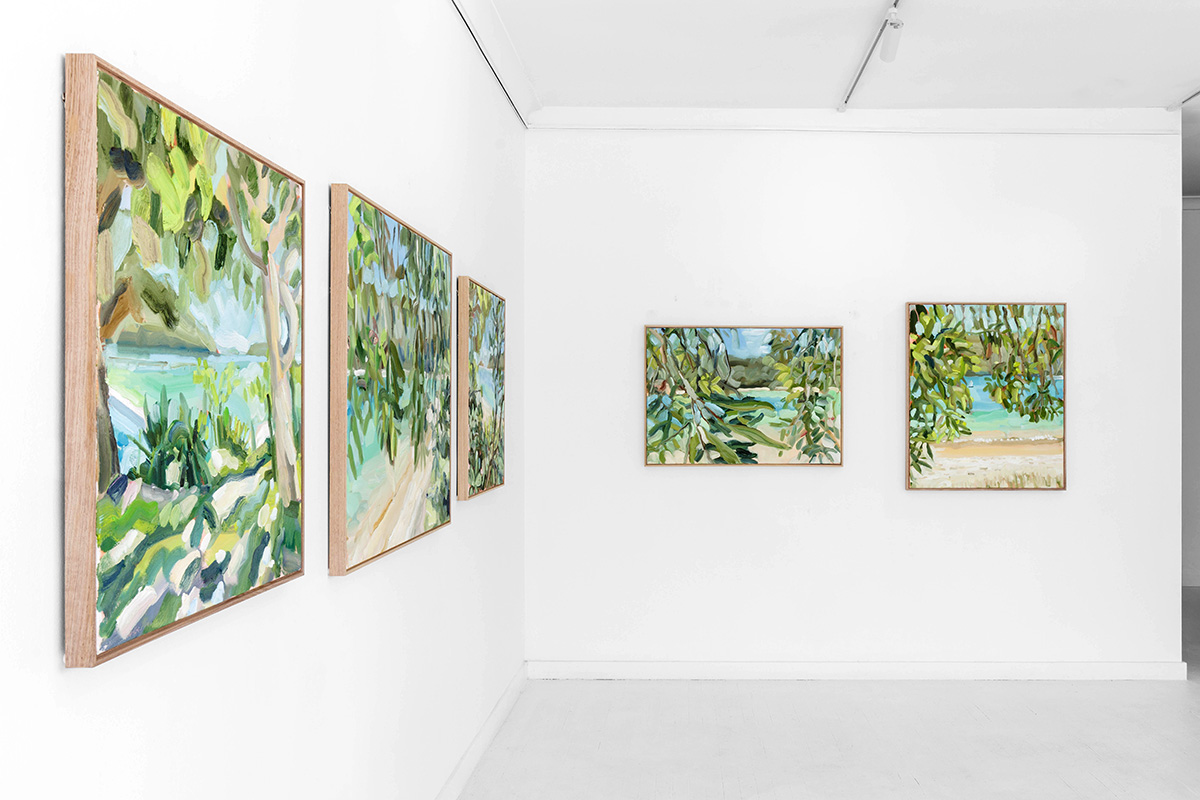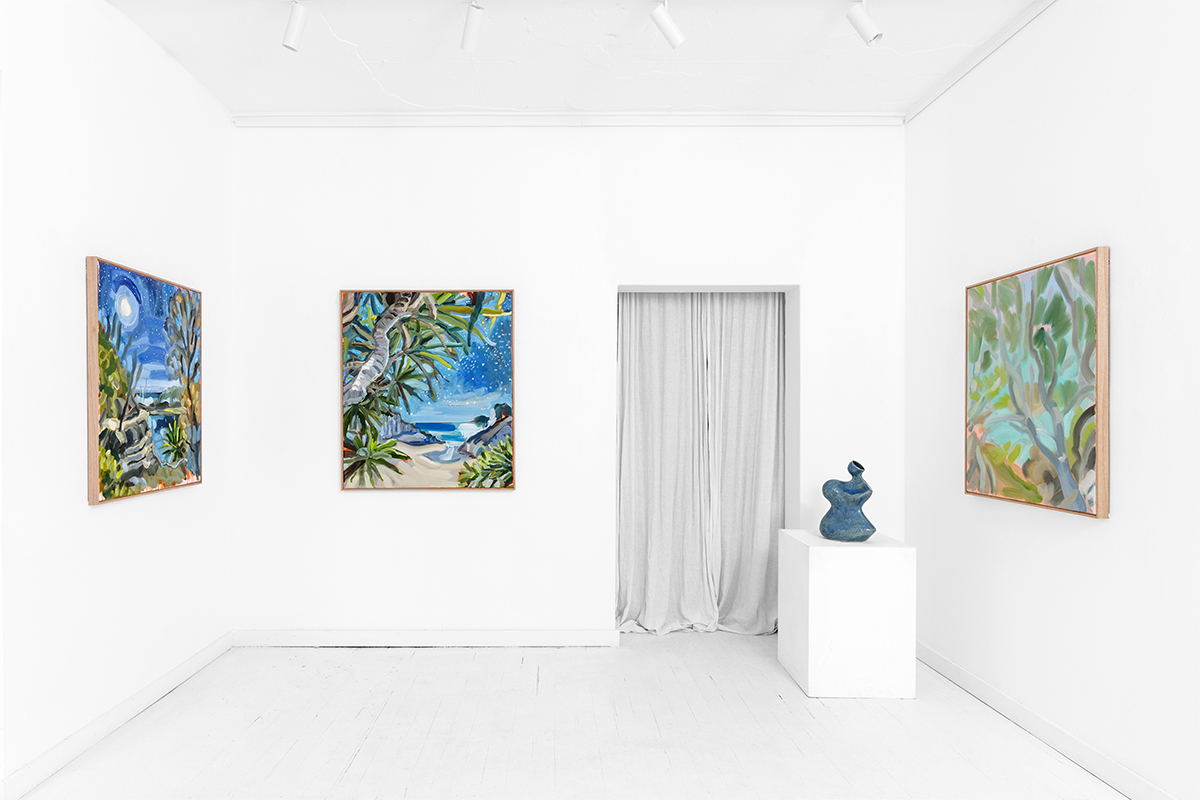 Alongside the sunlit seascapes that have become a hallmark of her practice, Coastal Canopies presents a suite of beachy nocturnes in which deep ultramarine skies appear dusted with a smattering of stars and moonlight glides above darkened waters and silhouetted trees. These paintings carry a hushed, enchanted atmosphere, evoking the particular magic of a breezy subtropical summer night soundtracked by the rhythmic roar of the ocean.