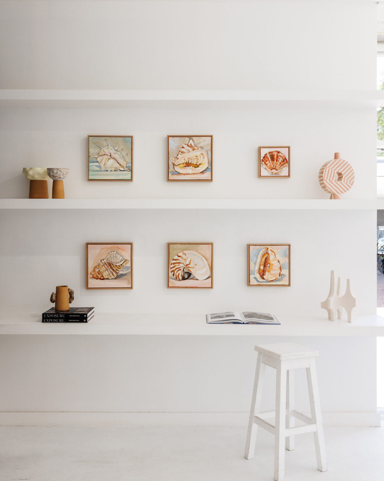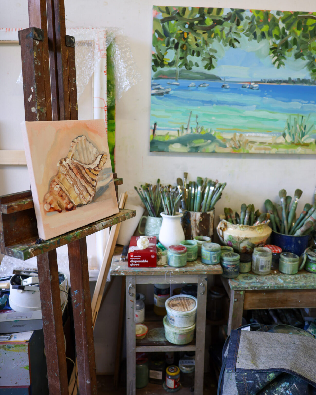 While Coastal Canopies is anchored by several expansive, immersive canvases, it is punctuated by a group of more intimate works depicting shells gathered from the shoreline. In these closely observed paintings, Waugh applies her expressive vocabulary to the sculptural forms of beachcombed finds, revealing their quiet monumentality and tactile presence. Together, the sweeping coastal vistas and these smaller studies speak to the breadth of her vision – from enveloping environments to moments of concentrated attention.