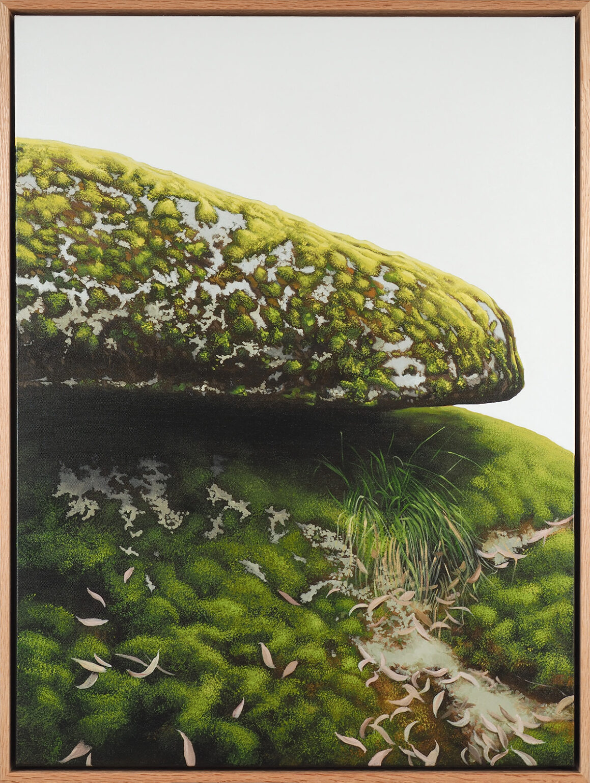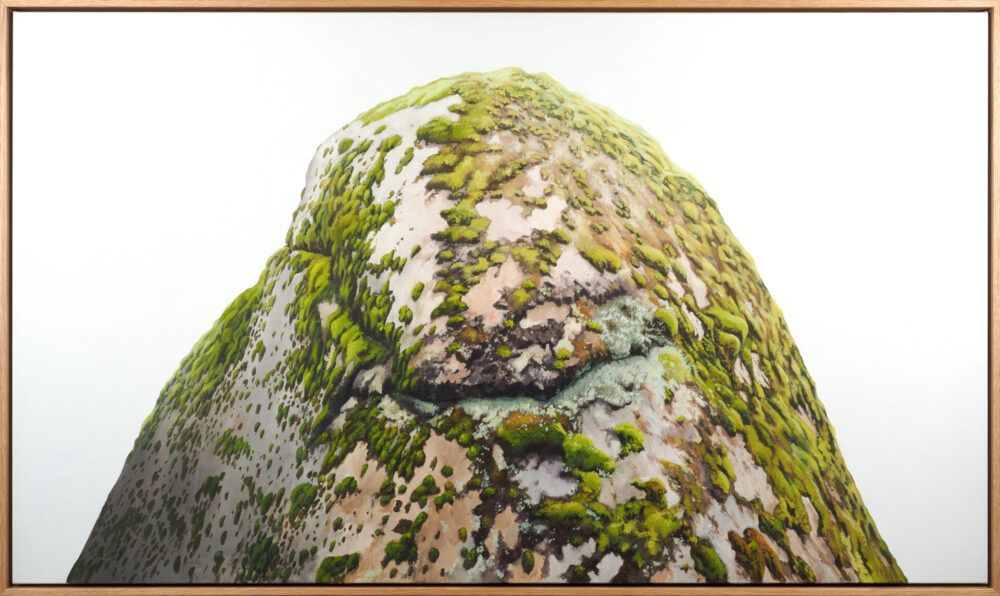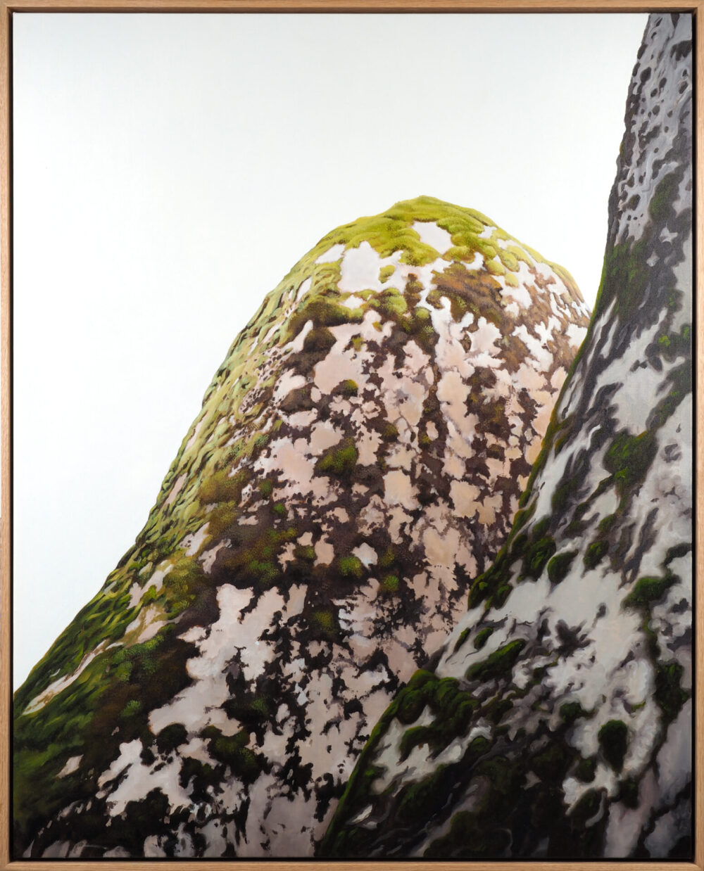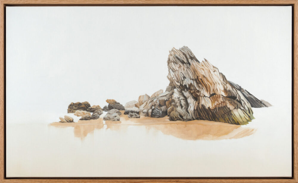 These works do not depict expansive vistas, but instead focus in on solitary rock forms—elements of the landscape that endure across time. Stripped of their surrounding context, they become vessels of accumulated memory, marked by the slow, persistent forces of transformation. Through careful observation, Liney invites viewers into a more attentive way of seeing—one that mirrors the quiet persistence of the landscape itself.