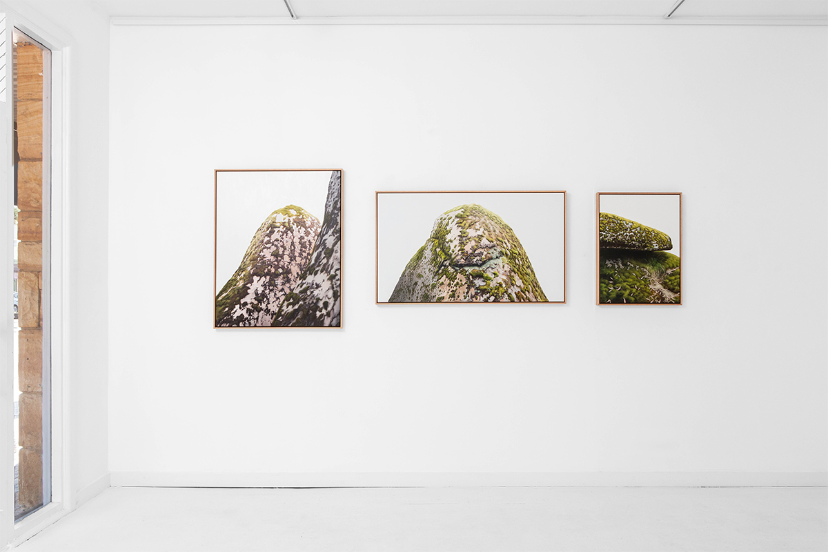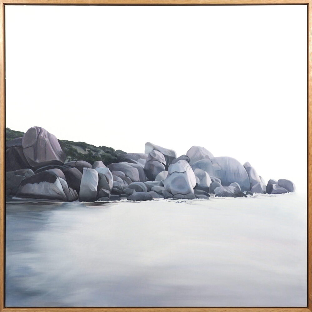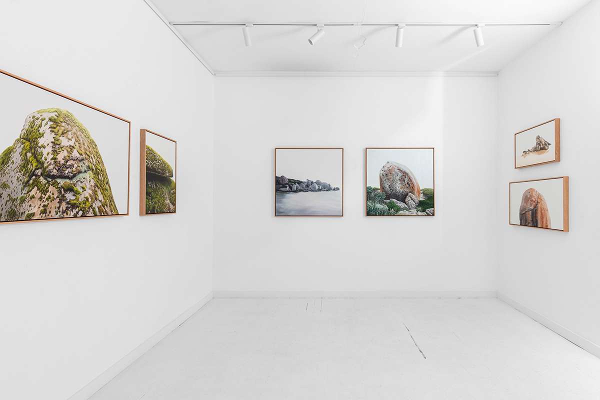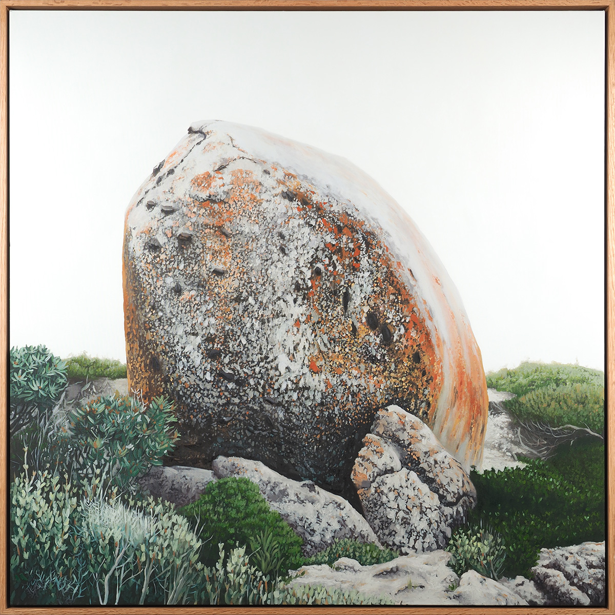These works do not depict expansive vistas, but instead focus in on solitary rock forms—elements of the landscape that endure across time. Stripped of their surrounding context, they become vessels of accumulated memory, marked by the slow, persistent forces of transformation. Through careful observation, Liney invites viewers into a more attentive way of seeing—one that mirrors the quiet persistence of the landscape itself.