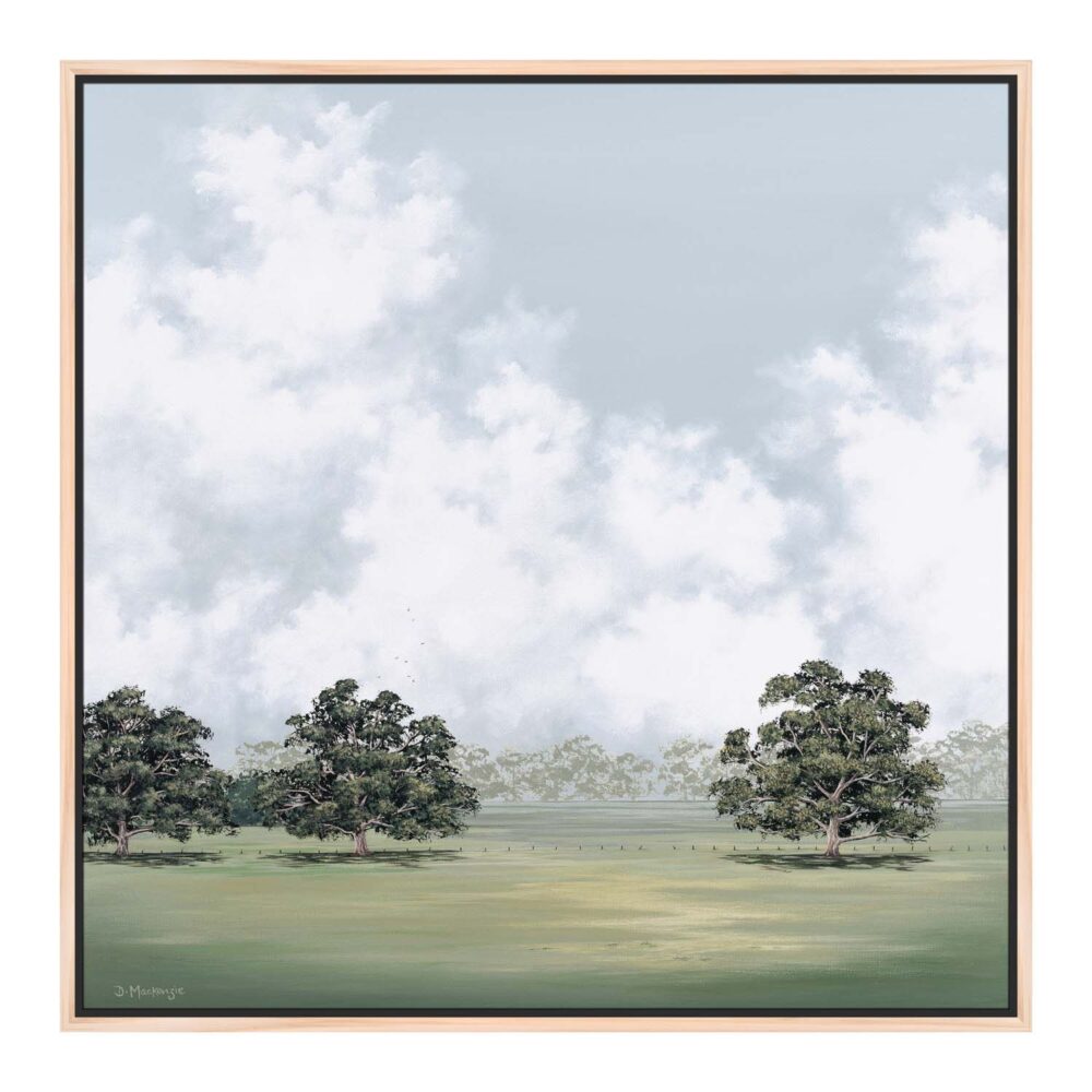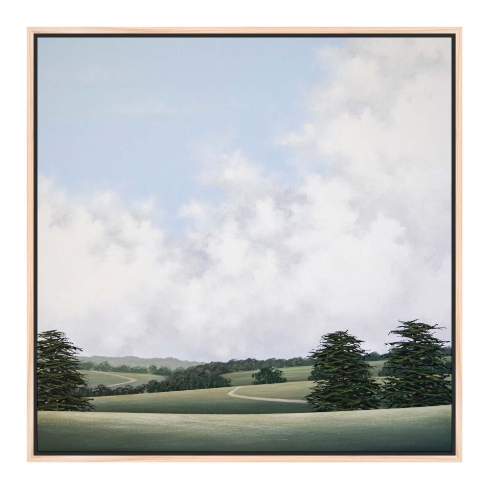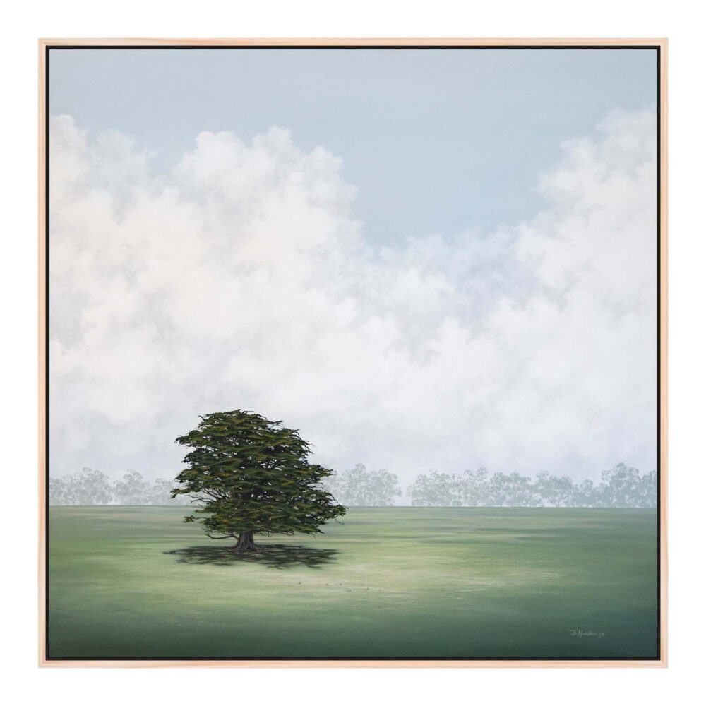 In awe of our environment and all its beauty of promising landscapes, dreamy atmospheres and the melancholy contemplation of the sky, is all part of Debbie’s engagement with the romantic. Debbie’s vision is about leaving the high pressured, time poor quality of modern life, escaping into the whimsical landscape of rolling green hills and grand old trees and majestic skies. Placing the viewer beneath a vast and epic sky that correctly reminds us of where we fit in nature, small but surrounded by beauty on a grand scale. Return to the days of a carefree childhood, to lie on the grass and watch clouds float by, not a care in the world. To indulge in that feeling when you view the work, best describes Debbie’s motivation.
